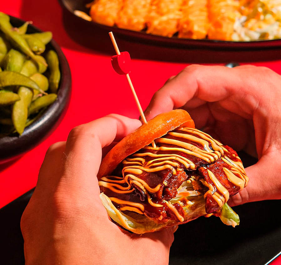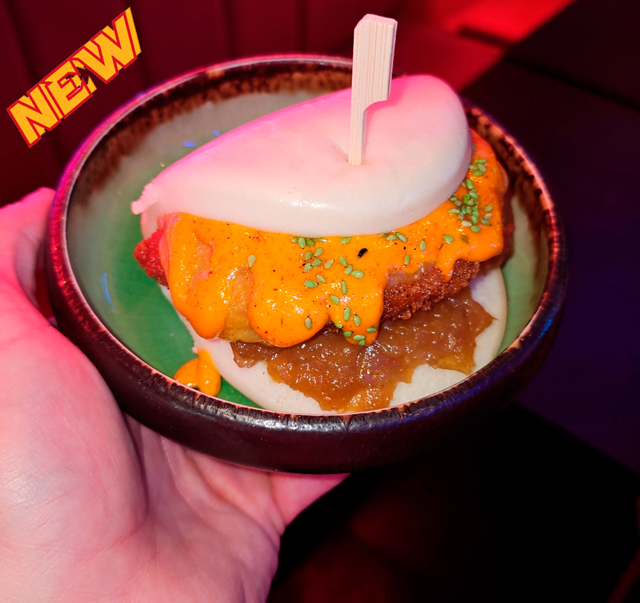 Bunbao de Pollo Crujiente con cebolla caramelozada, cheddar, nuestra salsa Emmy, semillas de wasabi y especias chinas